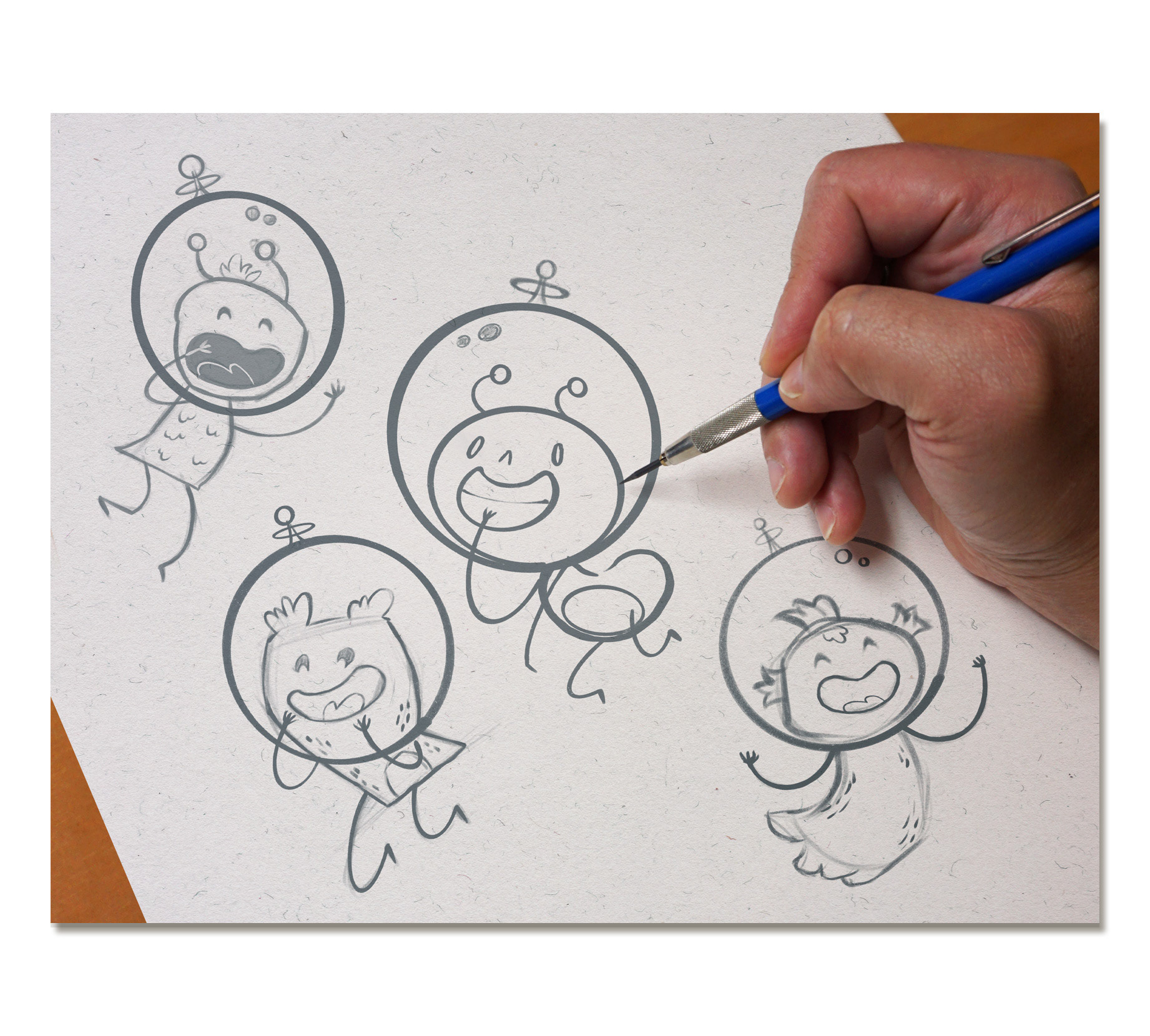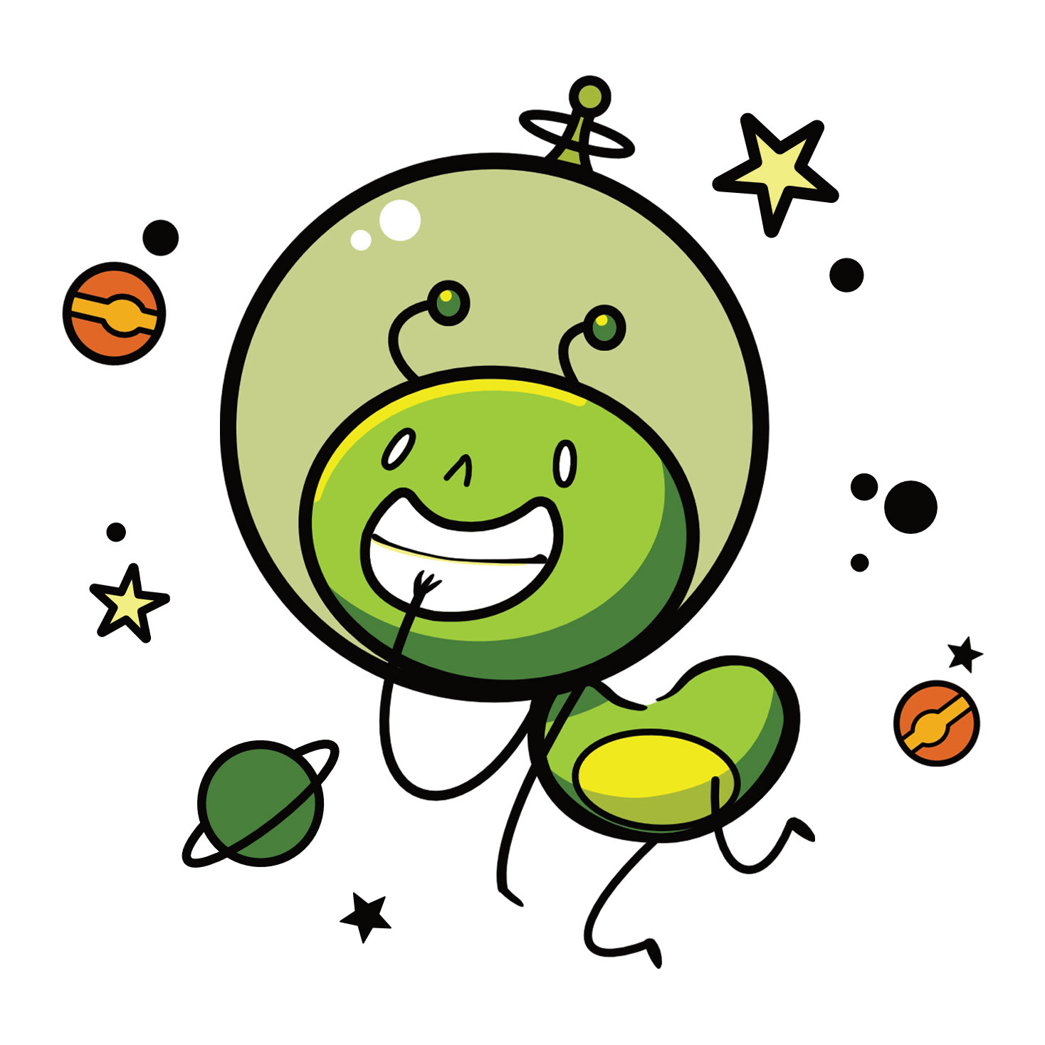 I went to work designing the alien mascot taking inspiration from cartoons and retro futurism. As part of my usual project process, I created three sketches to give the library options to decide between.
