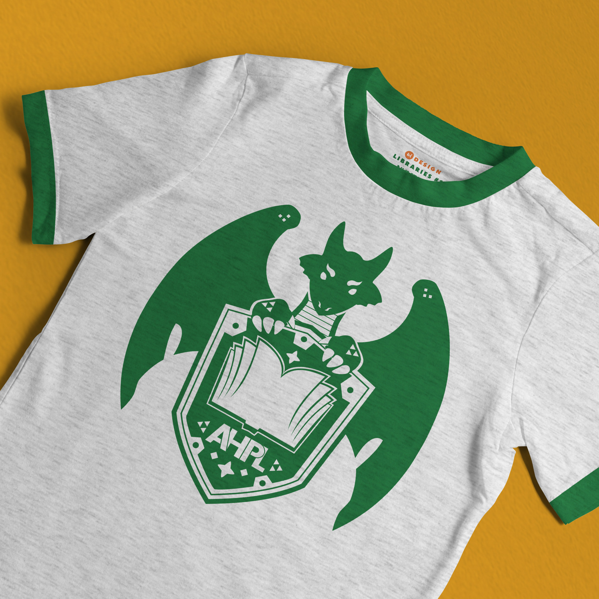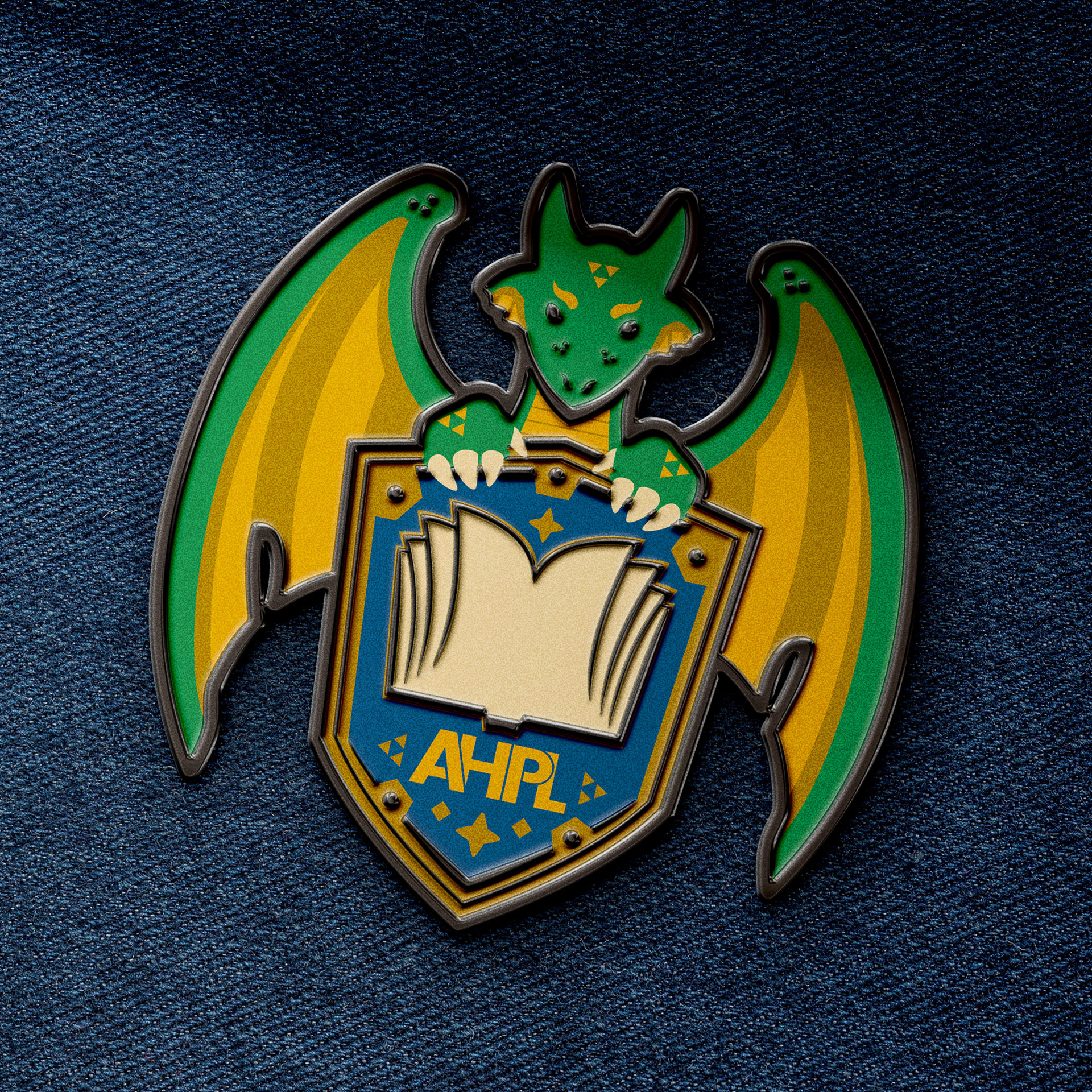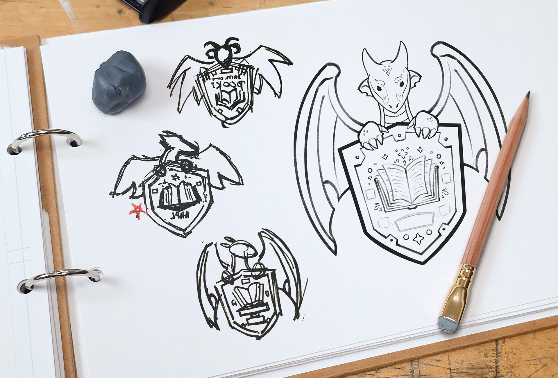 We explored various fantasy themes focusing on knights & dragons and arrived at the idea of the classic shield crest being held by a dragon. This embodied the original medieval theme the library pivoted to and had a sense of history by using the crest motif. The dragon was drawn in a rounded welcoming style to appeal to all ages.