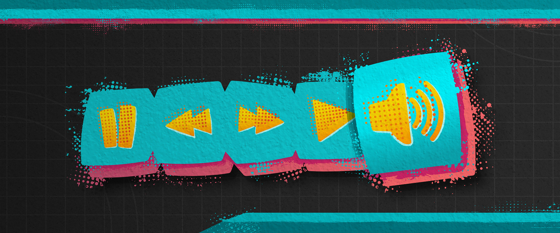 In expanding off the play button visual, we developed a series of icons inspired by the playback conrtols of boomboxes, Walkmans, and VHS players: retro fun combined with vibrant 90's colors, and a touch of texture to break the digital space.